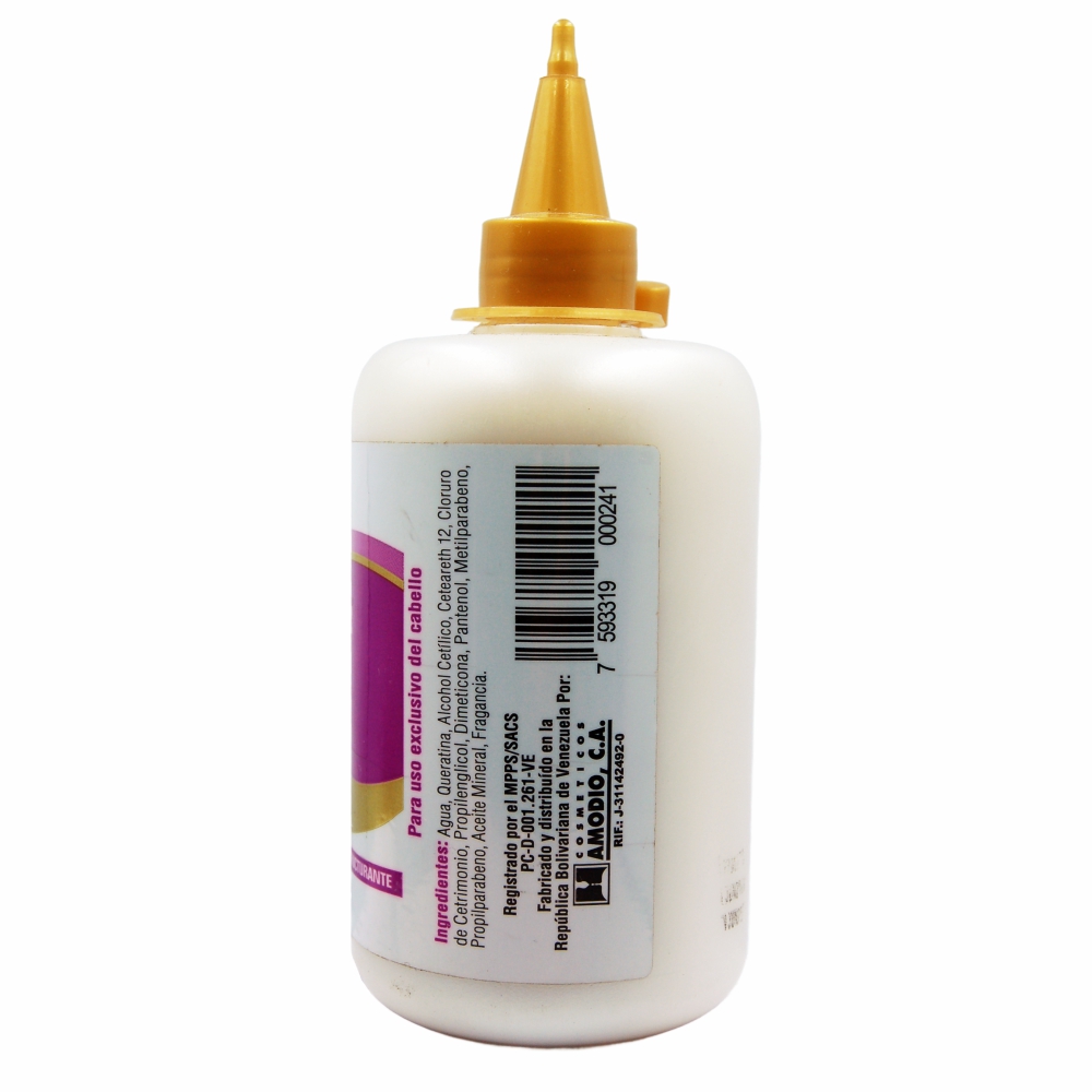 Agua, Queratina, Alcohol Cetilico, Ceteareth 12, Cloruro de Cetrimonio, Propilenglicol, Demiticona, Pantenol, DMDM Hidantoína, Aceite Mineral, Fragacia.
