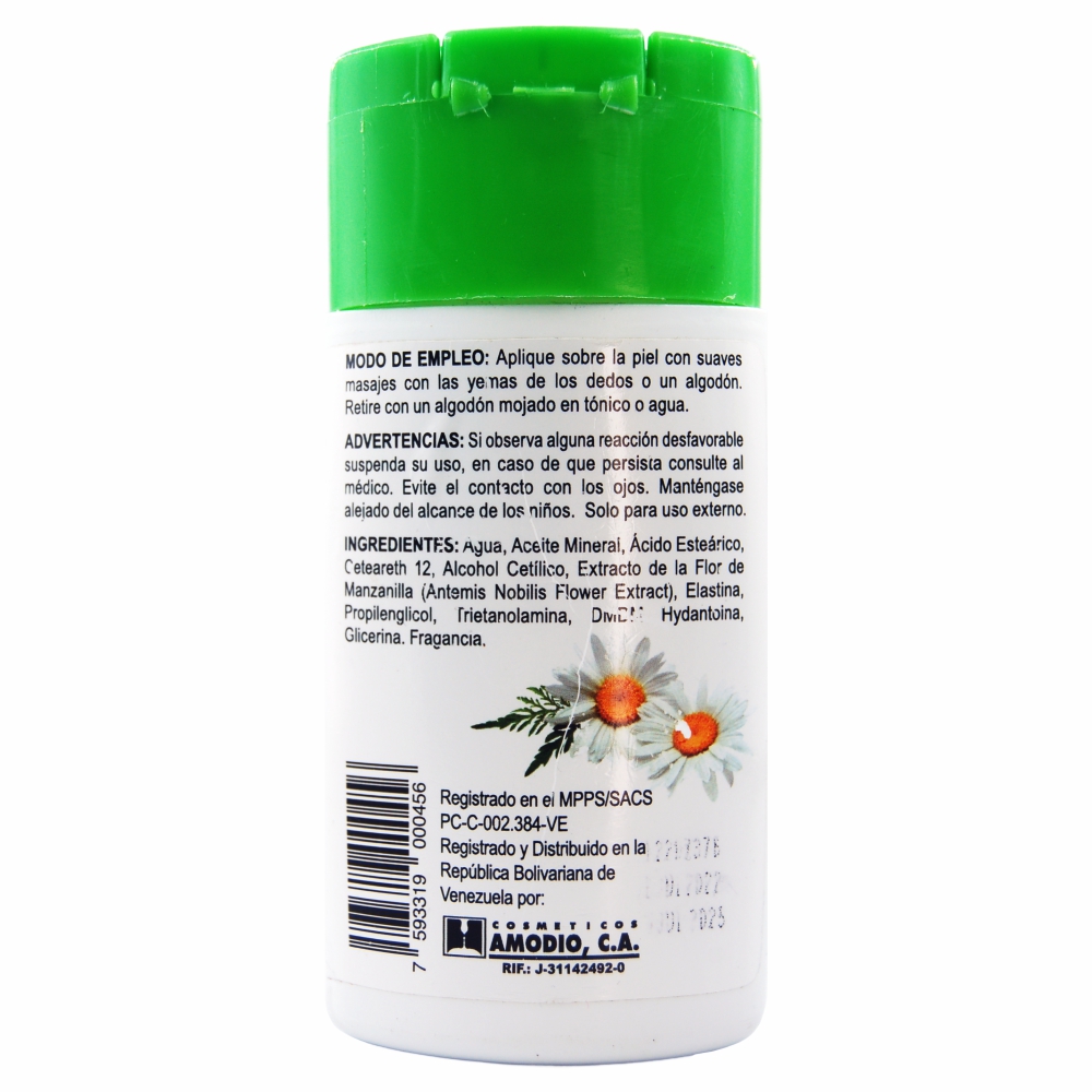 Agua, Aceite Mineral, Ácido Esteárico, Celeareth 12, Alcohol Cetilico, Extracto de la Flor Manzanilla (Antemis Nobilis Flower Extract), Elastina, Propilenglicol, Trietanolamina, DMDM Hidantoína, Glicerina, Fragancia.