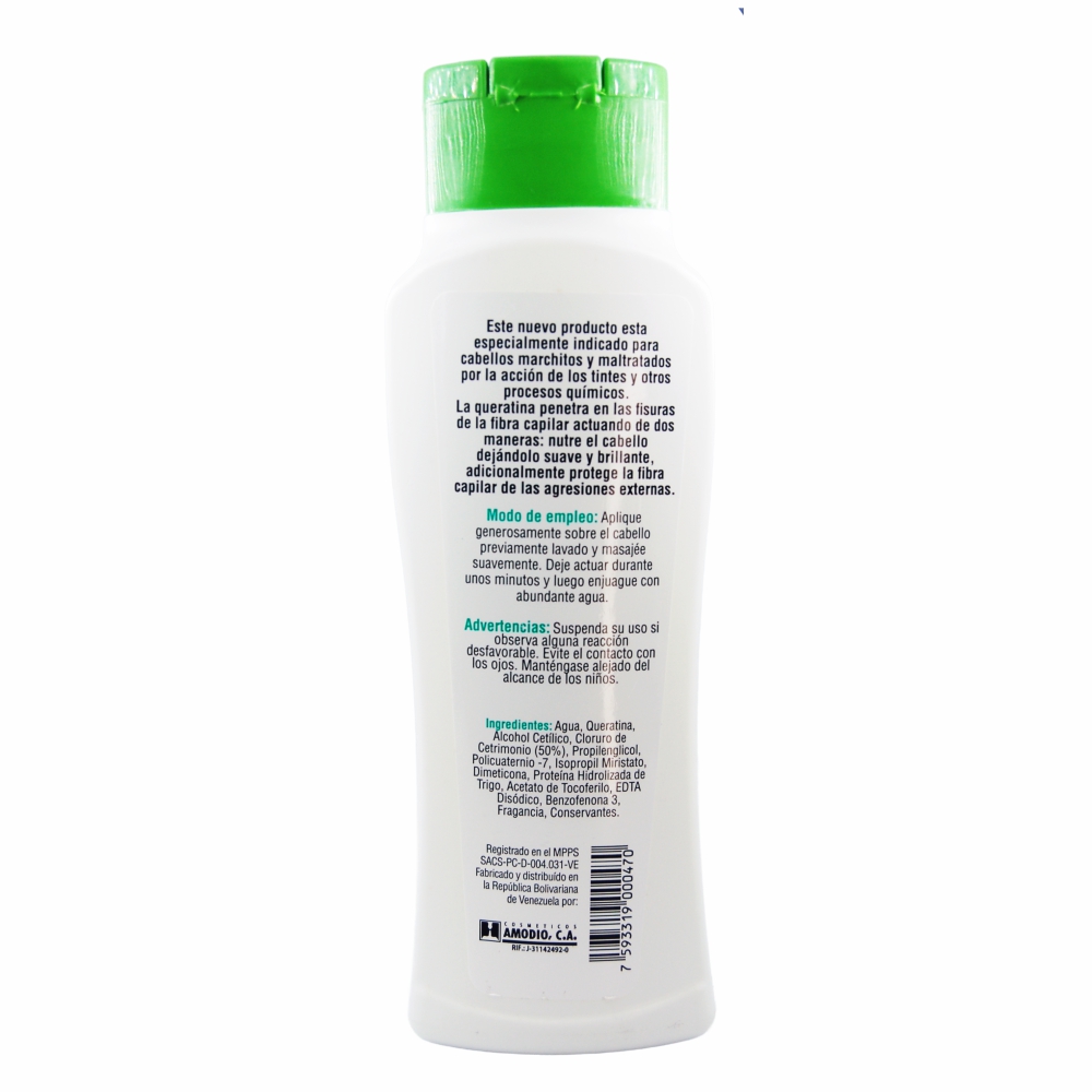 Agua, Queratina, Alcohol Cetilico, Cloruro de Cetrimonio (50%), Propilenglicol, Policuaternio -7, Isopropil Miristato, Dimiticona, Proteina Hidrolizada de Trigo, Acetato de Tocoferilo, EDTA Disódico, Benzofenona 3, Fragancia, Conservantes.